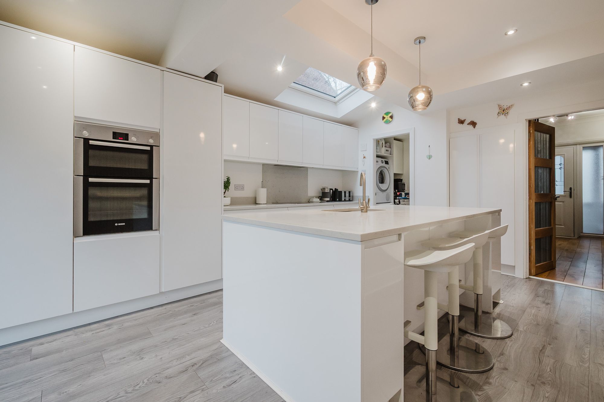 The contemporary kitchen is fitted with high-quality cabinetry and integrated appliances, complemented by a practical utility room, ideal for laundry and additional storage. A convenient downstairs cloakroom adds further everyday practicality.