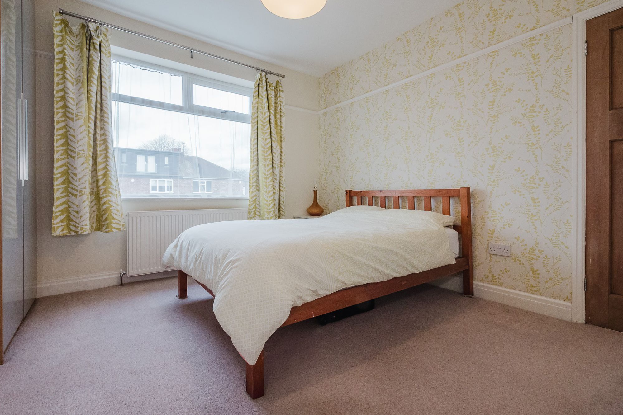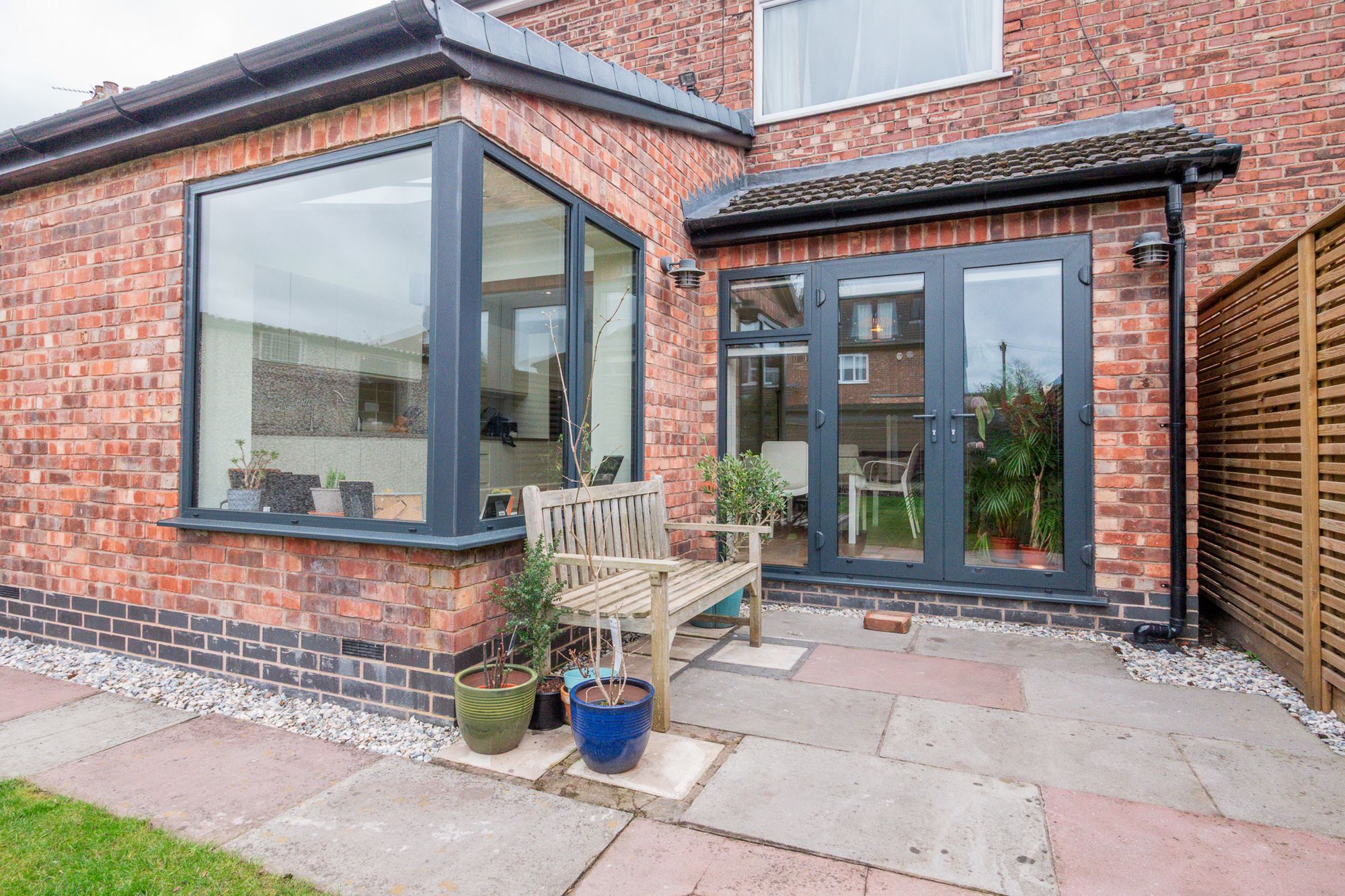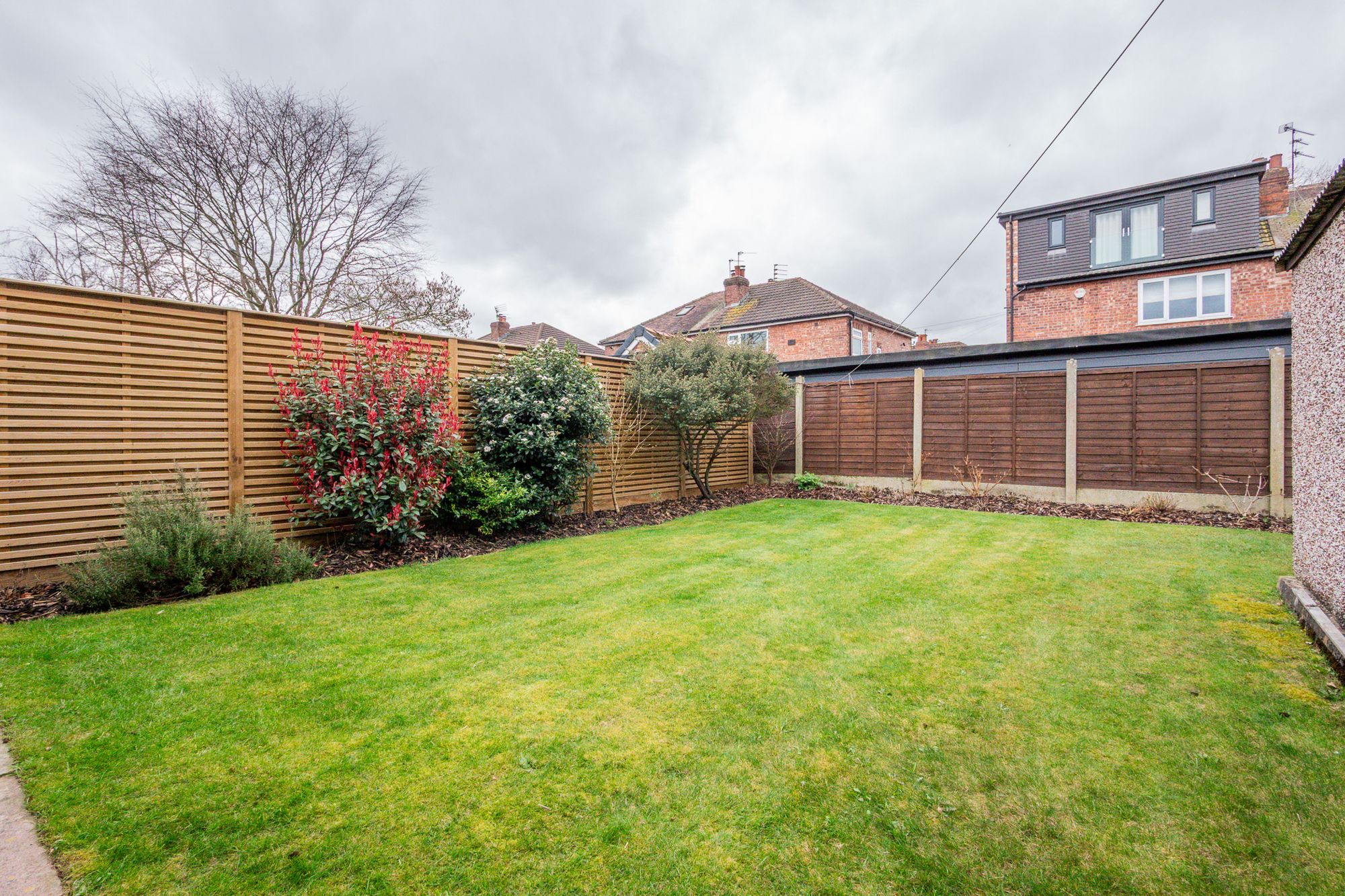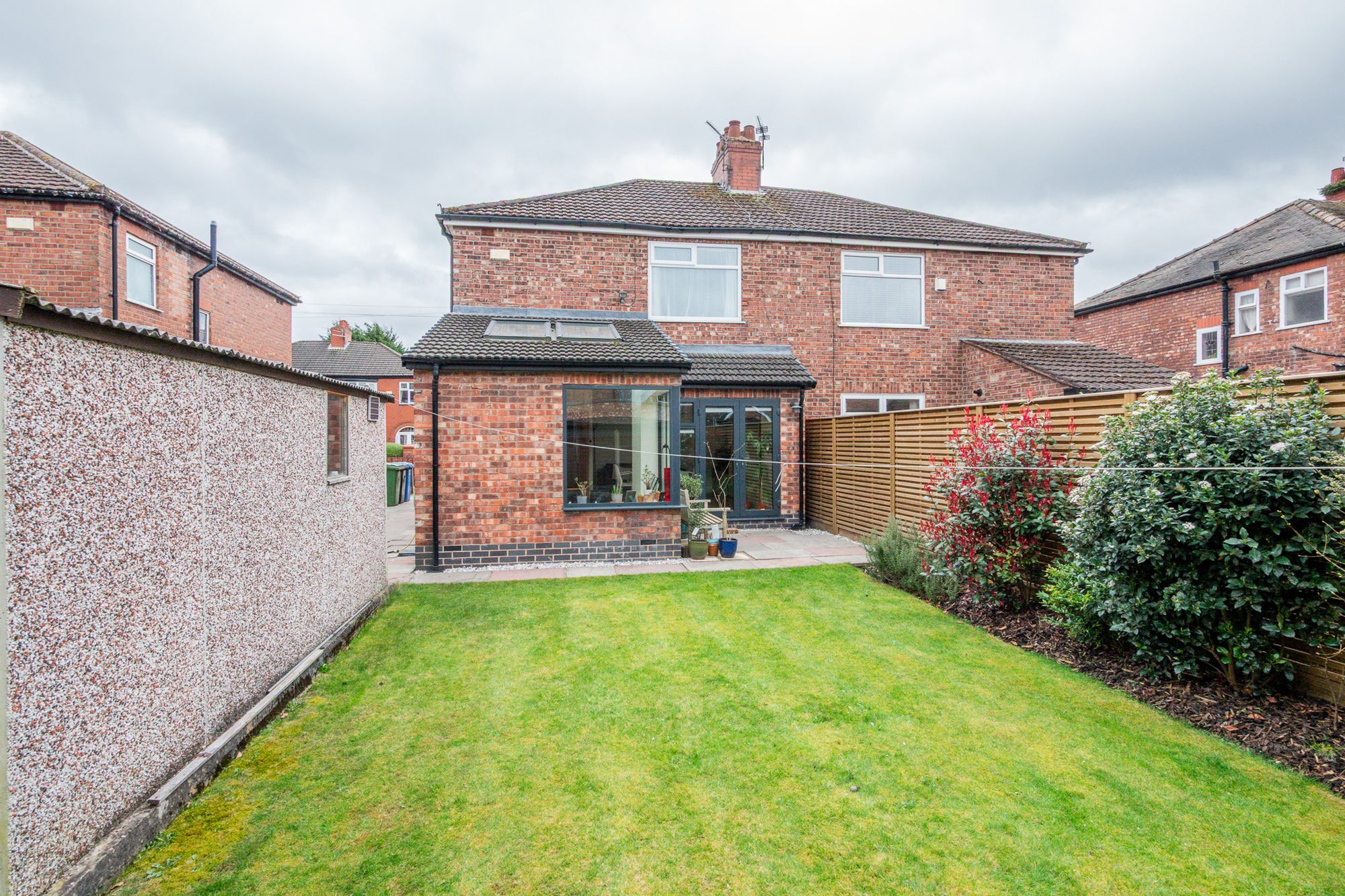 Double patio doors from the kitchen provide an abundance of natural light and create a seamless connection between indoor and outdoor living, opening out onto a large, well-maintained lawned garden that offers plenty of space for outdoor seating, entertaining, or family activities.